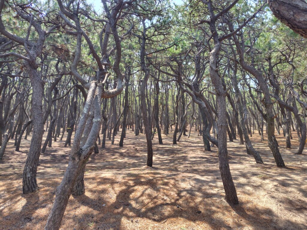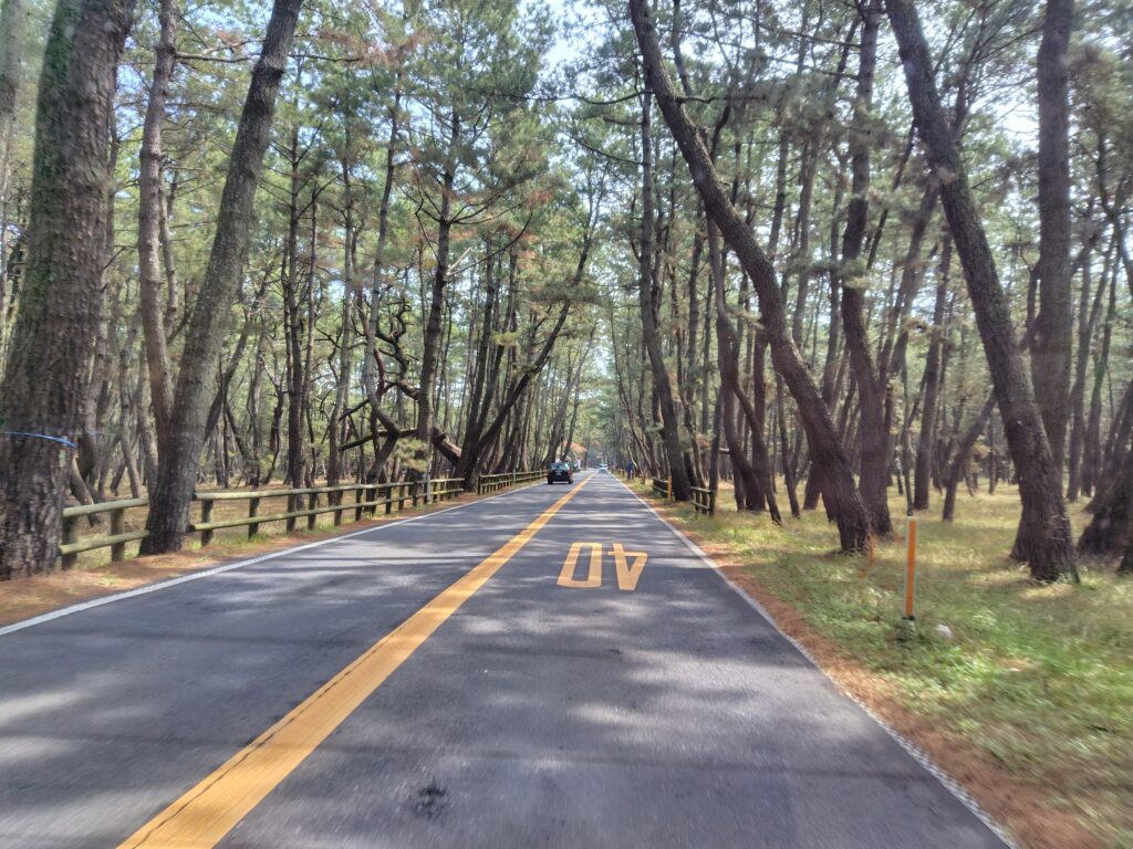 駐車場を少し移動します。からつバーガーの駐車場は続々と車が入ってくるので、すぐ近くにあった別の駐車場へ。少し松原内を歩いてみます。見渡す限りの松。風の影響で大きく曲がった木々が多いところもあり、自然の雄大さを感じます。