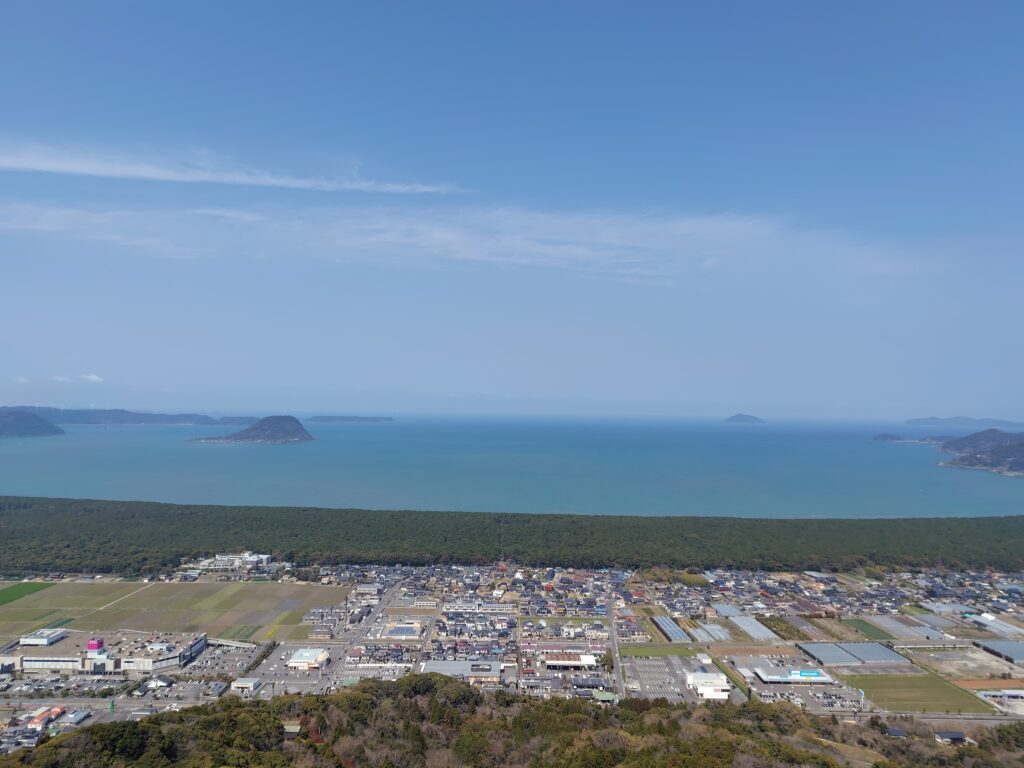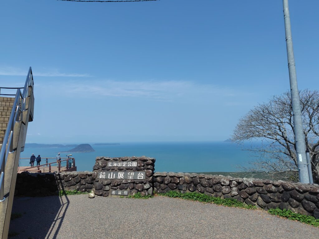 もう少し松原を感じたいと思い、別のところへ。その広さを感じるため、上から見てみようと思います。車で数多の急カーブを越え、鏡山に登ります。車で登れるのも手軽でありがたいです。上から見ると、本当に広大な範囲が緑で覆われており、その規模がよく分かります。車で虹の松原に来た場合は、ぜひ鏡山まで足を運ぶべきだと思います。