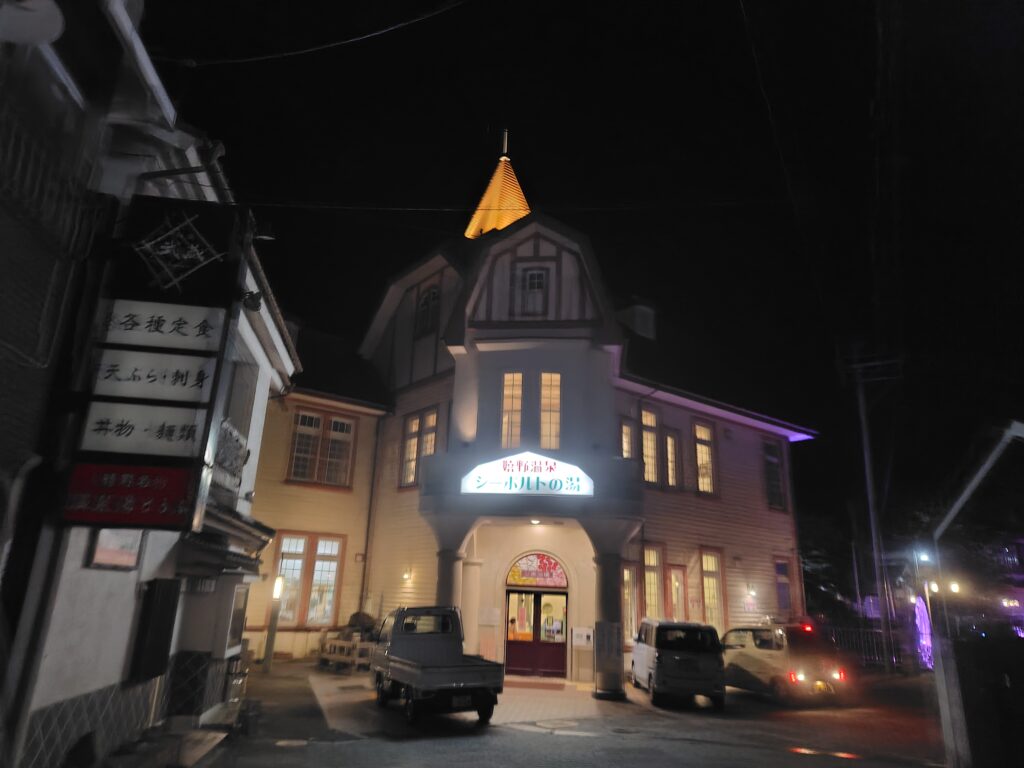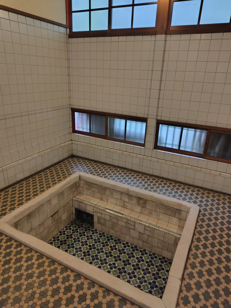 門を越えると温泉が。同じ建物?に元湯と蓬莱湯がありましたが、元湯へ。ぬる湯とあつ湯の2種類がある、歴史を感じる浴室でした。あつ湯はおそらくかけ流しで、じっくりと温まれる最高の湯でした。45度ほどでかなり熱かったですが、短時間でパッと楽しむ分には最高です。